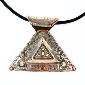 Traditional sterling silver Tuareg necklace on leather braided cord.
